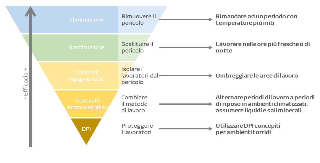La gerarchia dei controlli, in originale hierarchy of controls, è un concetto dovuto al National Safety Council, una organizzazione no-profit e non governativa, fondata nel 1913 da un gruppo di industriali e tecnici nordamericani, con l’obiettivo di promuovere la sicurezza della vita umana nelle industrie degli Stati Uniti. Questo modello è noto attraverso la rappresentazione … Continua a leggere Stress termico e gerarchia dei controlli: come gestire il lavoro in condizioni climatiche estreme? | Teknoring